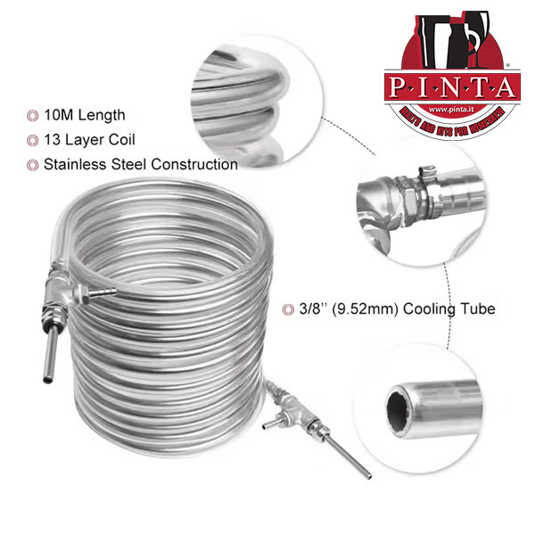 Serpentina a controflusso in acciaio inox per birra artigianale, 10 m, 13 strati, raffreddamento rapido del mosto. Tubo inox 3/8'' con rivestimento PVC.